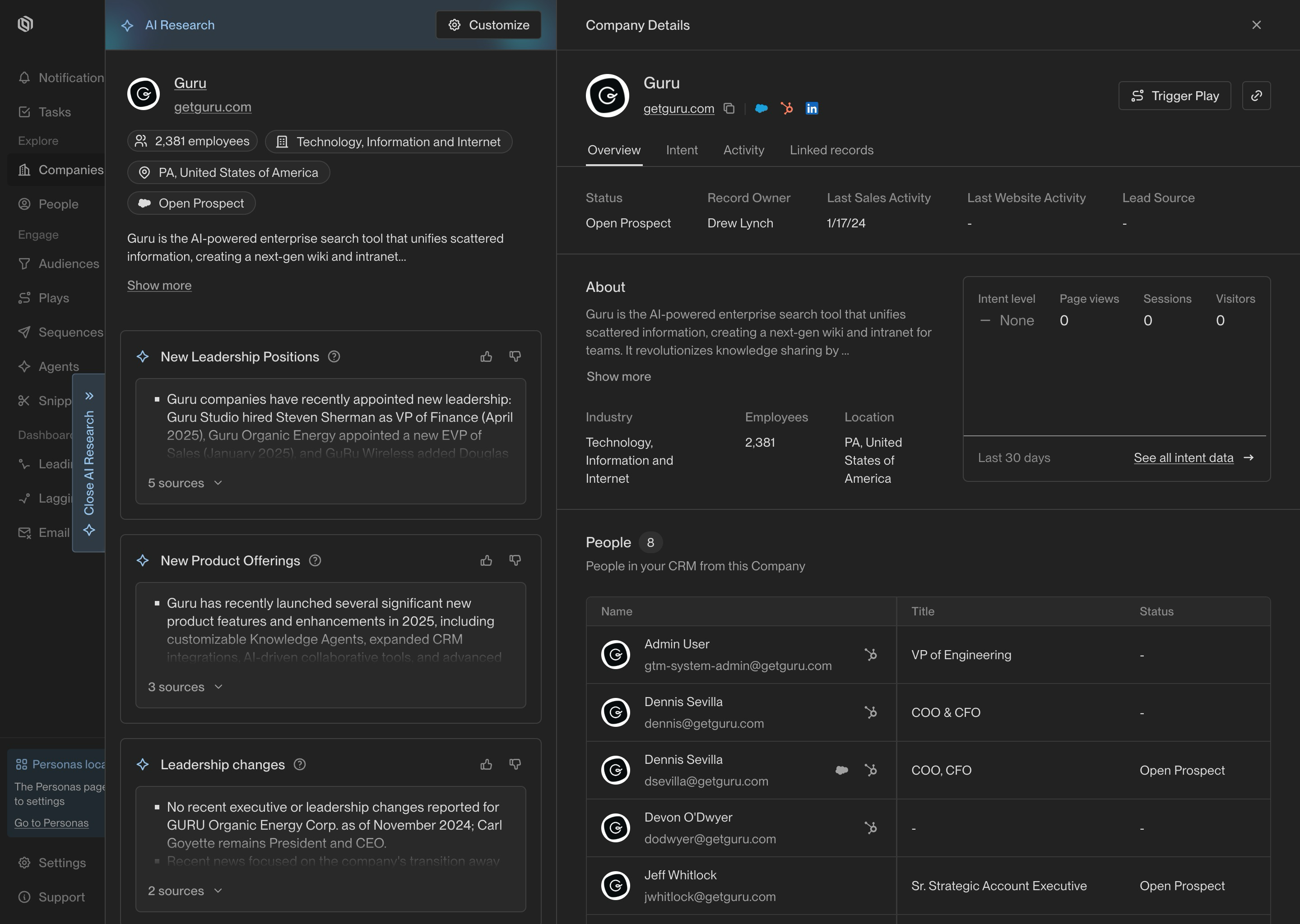 To access AI Research, you can click on the AI Research tab on any Task, Company, or Person page. AI Research will be automatically generated for Tasks, but for Company and People pages, they can be generated on demand.