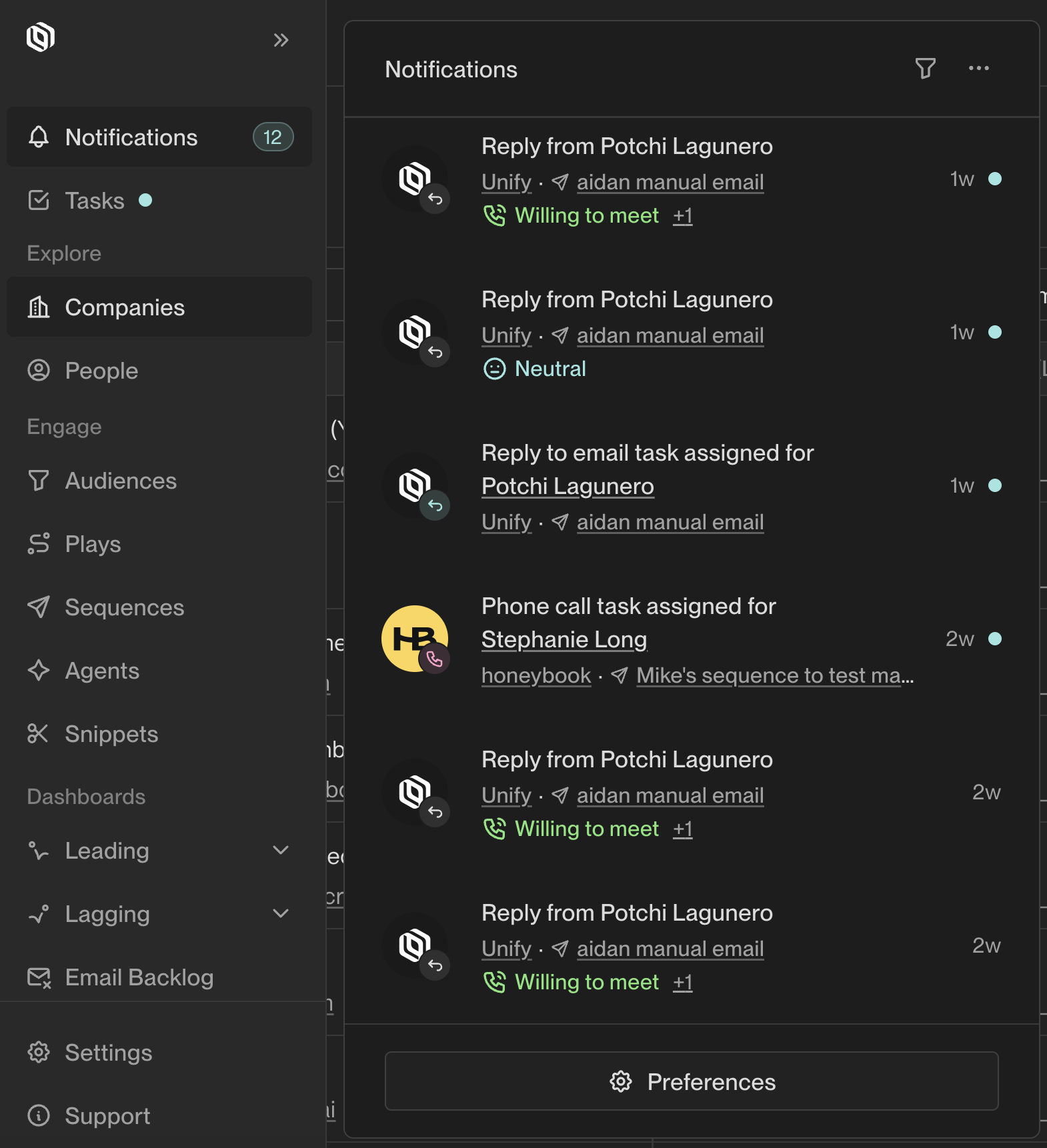 Notifications help you stay on top of important updates — from positive replies to Sequences to ensuring no tasks slip through the cracks. Notifications are available both in-app and through Slack, giving teams visibility wherever they work.Notification Types