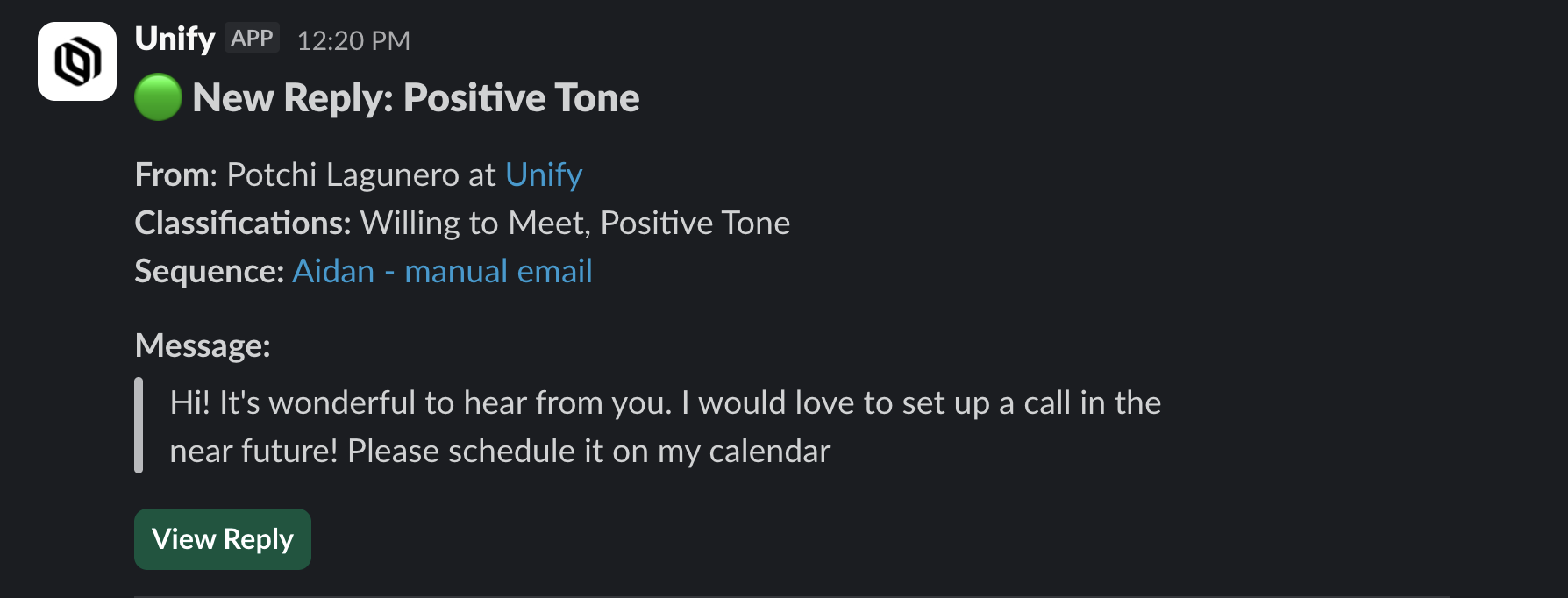Receive a notification when prospects reply to your Sequences. Admins can customize which reply classifications trigger notifications. Slack notifications can be sent to shared channels to increase team visibility.