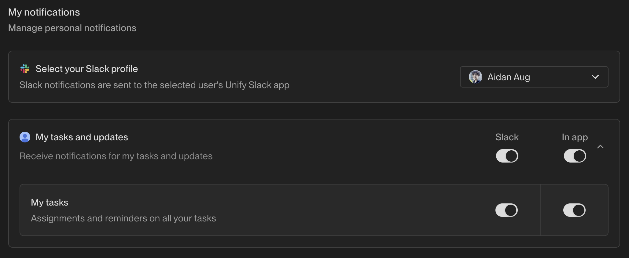 To receive Slack notifications, you need to connect your personal Slack profile to Unify.1
