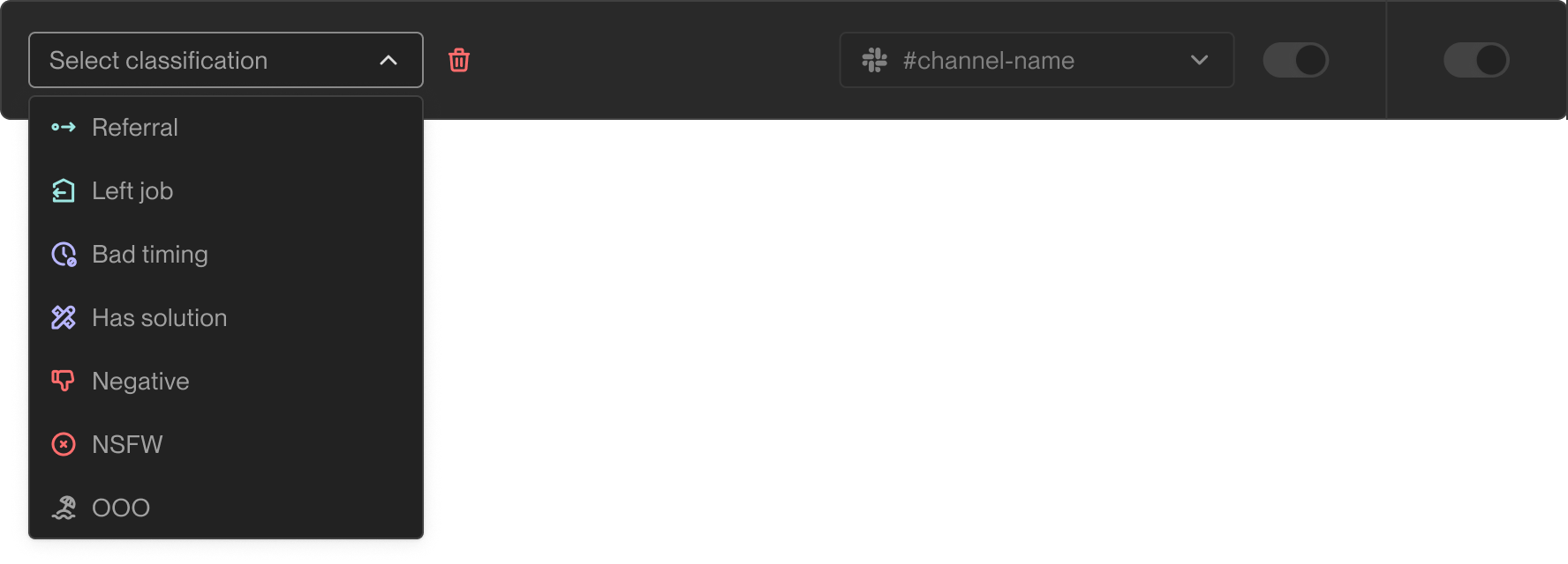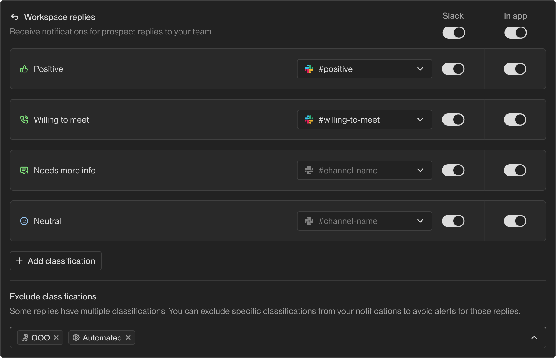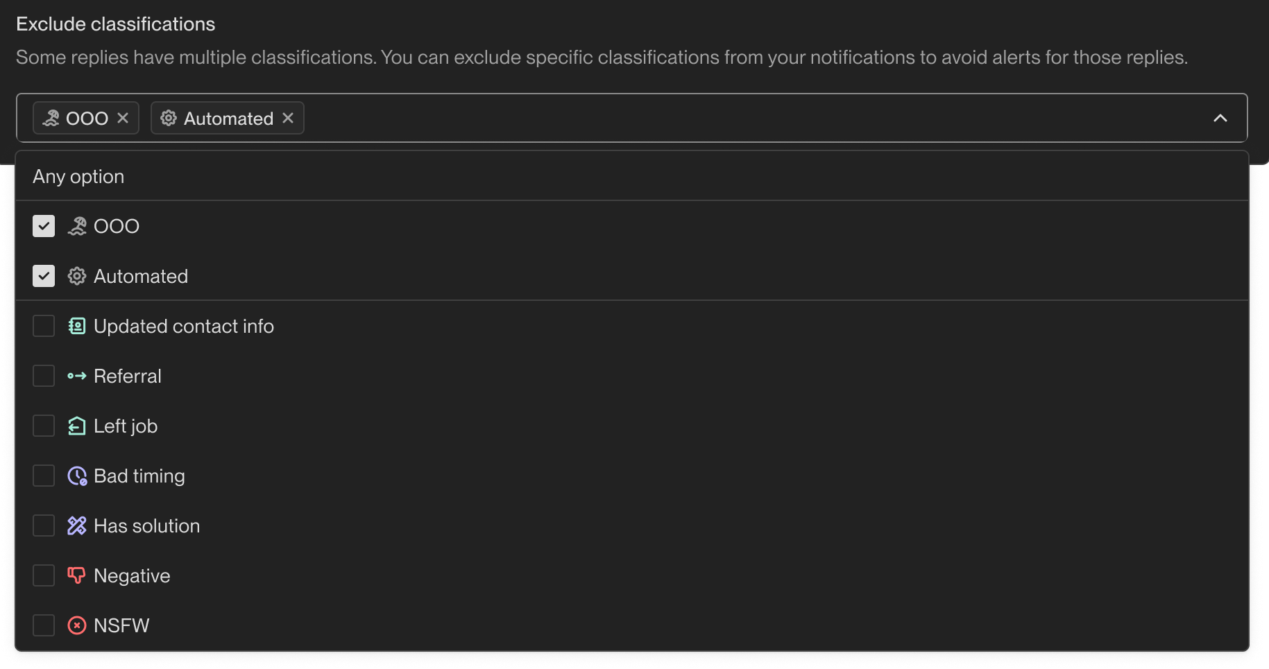 Some replies can have multiple classifications. You can exclude specific classifications from triggering notifications. If a reply has any excluded classification, no notification will be sent, even if it also has other classifications that would normally trigger an alert. Common exclusions include:- OOO (Out of Office) — Automated away messages
