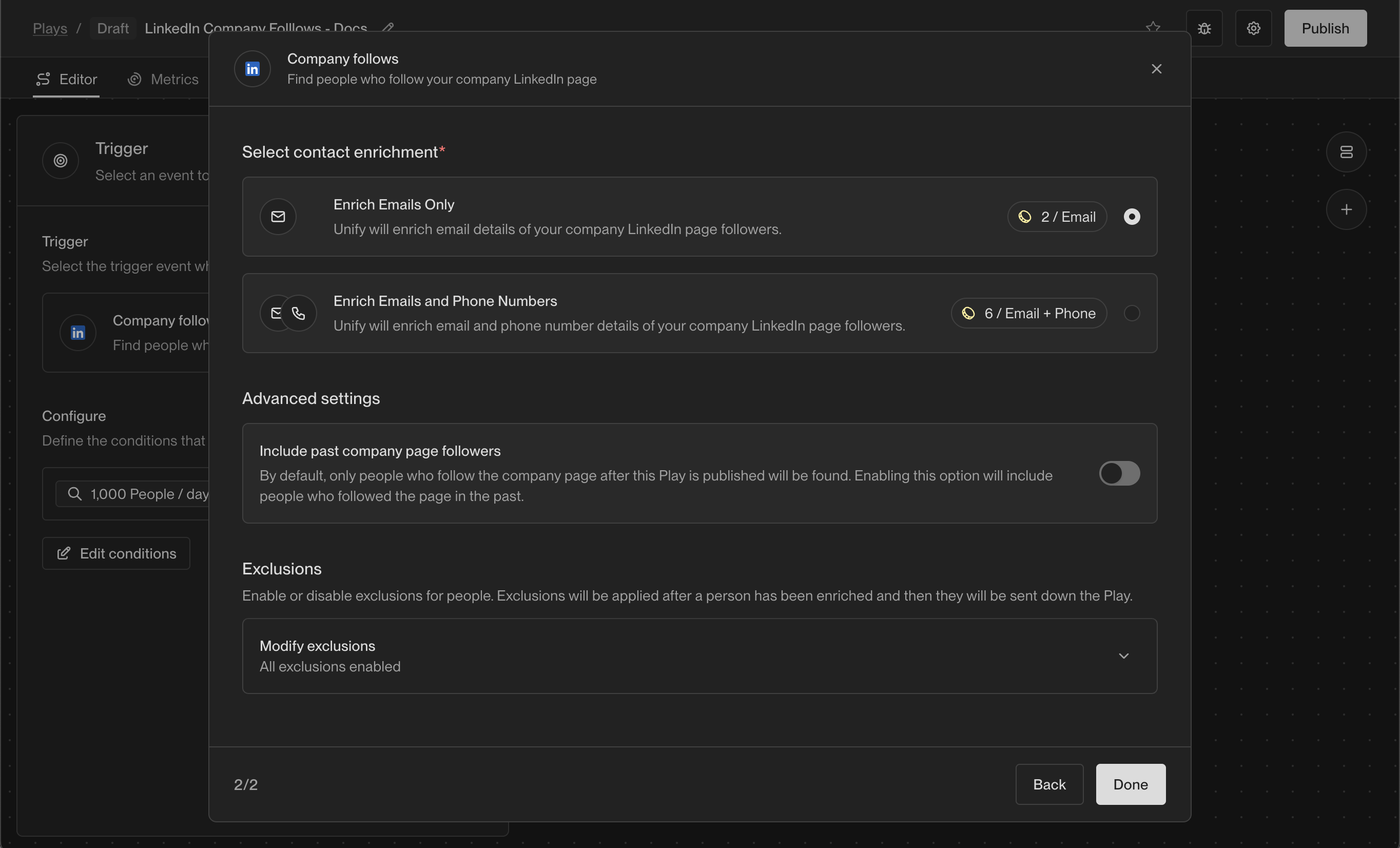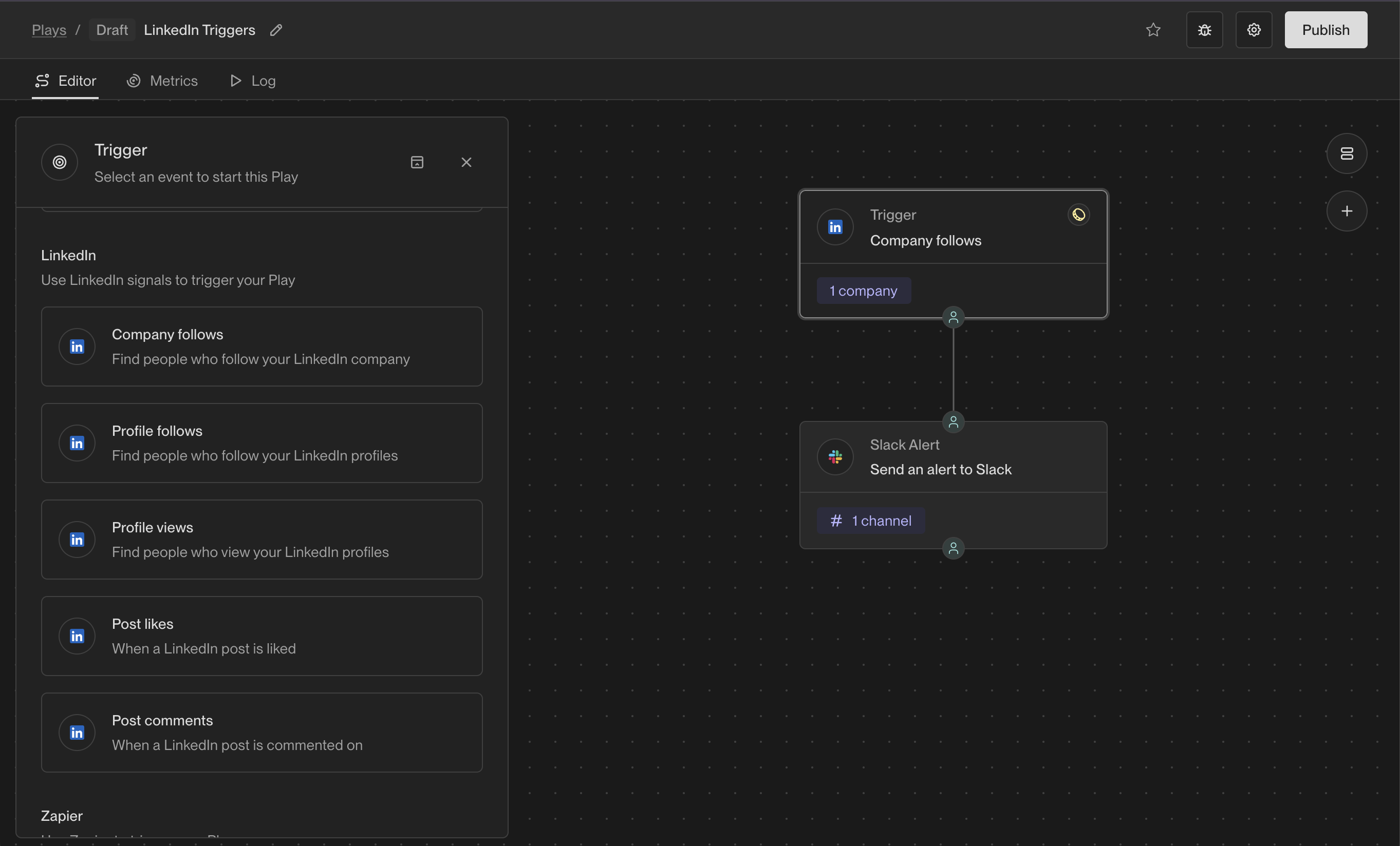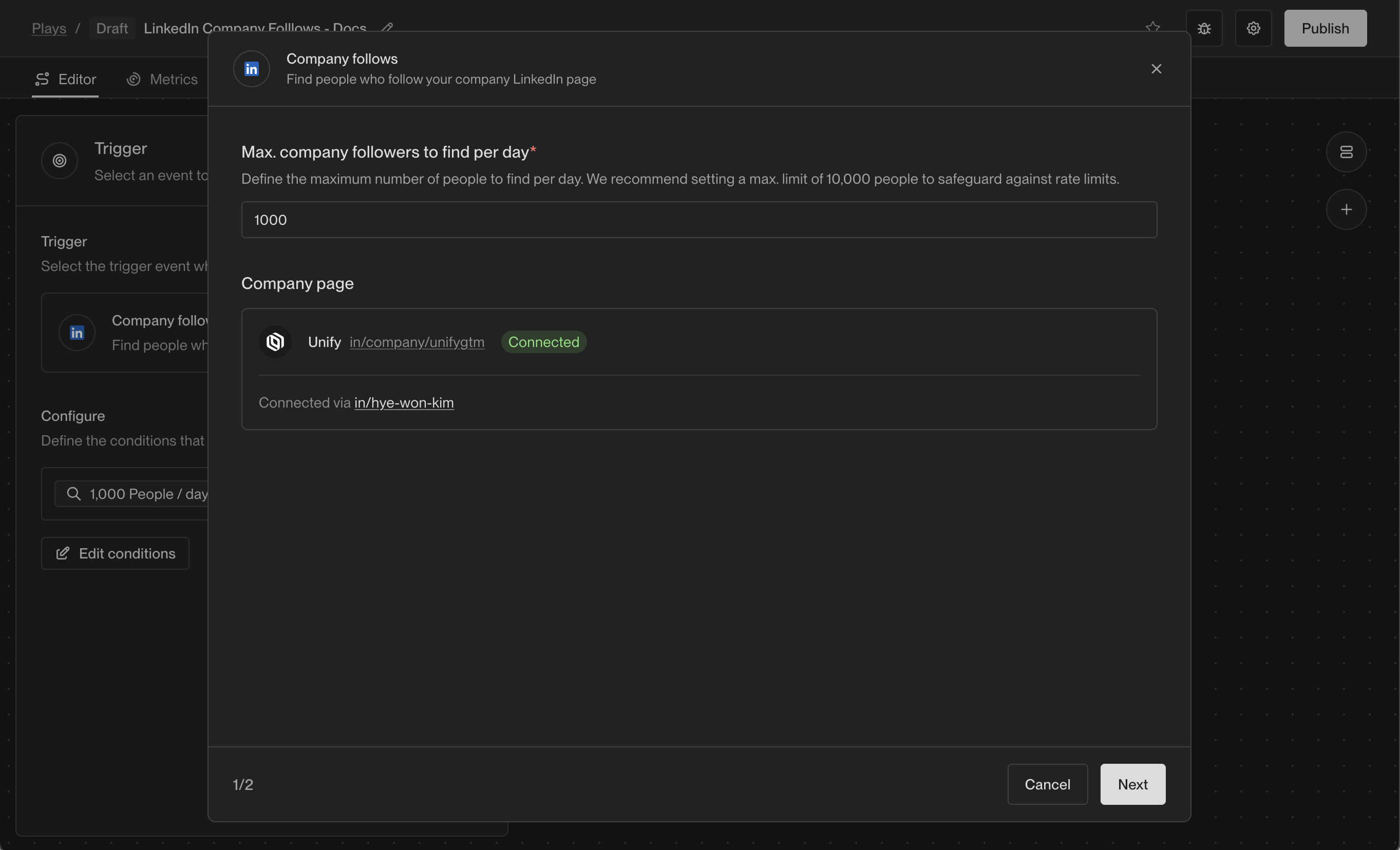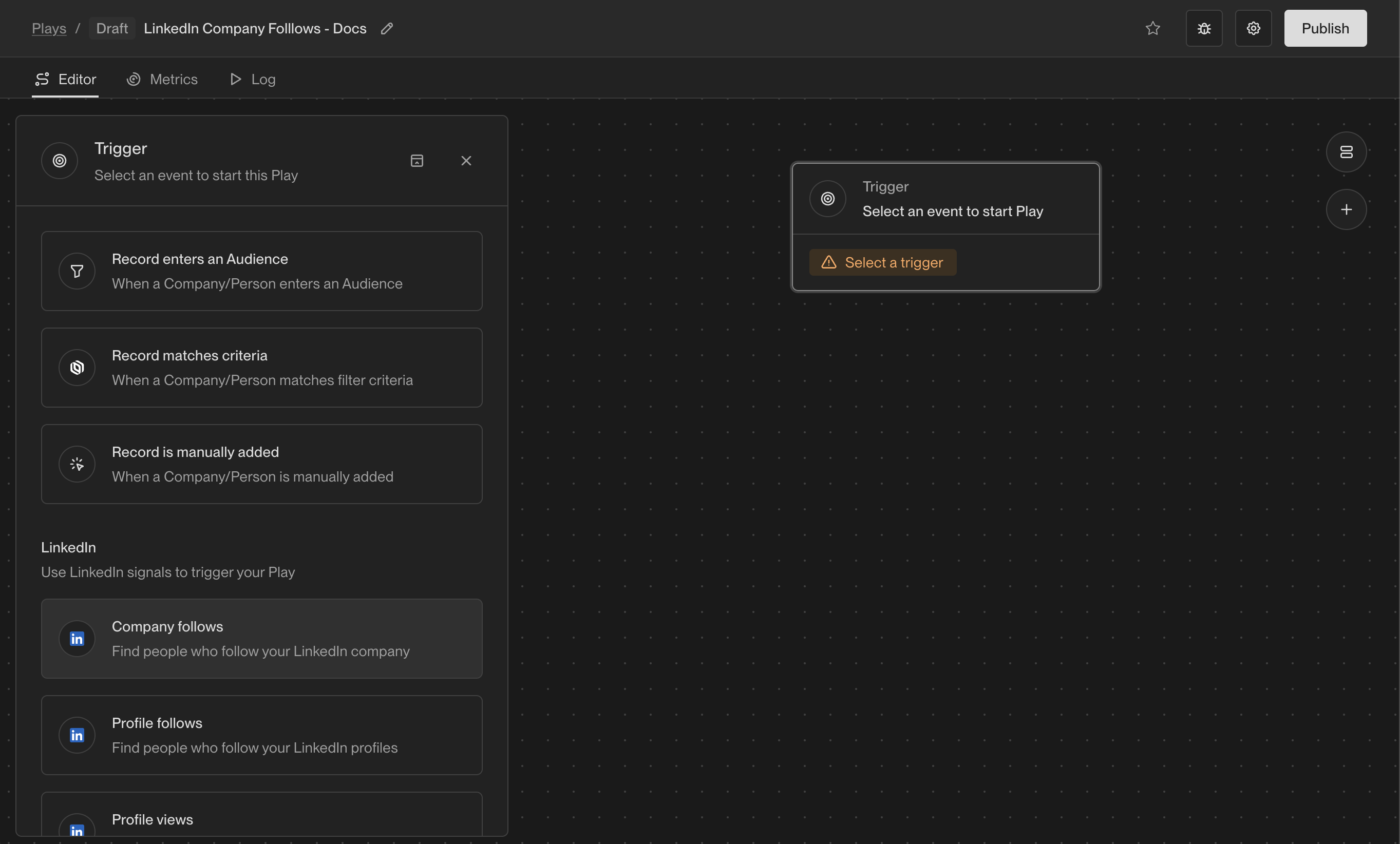 In this section, we will discuss how to build a new Play with the LinkedIn Company Follows trigger. For more detailed information on how to build a new Play, see Building a Play section of the Unify docs.