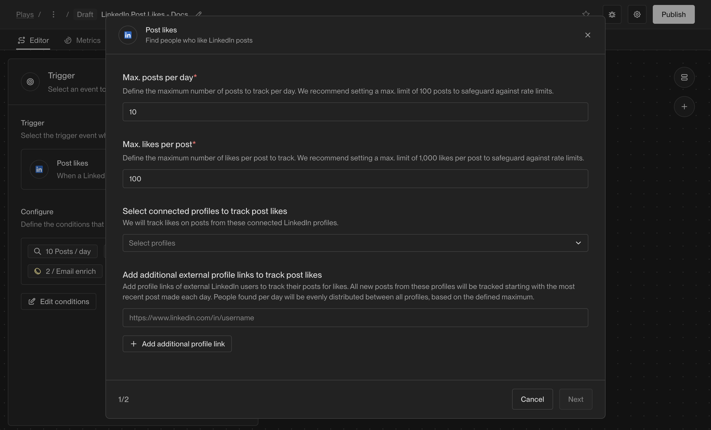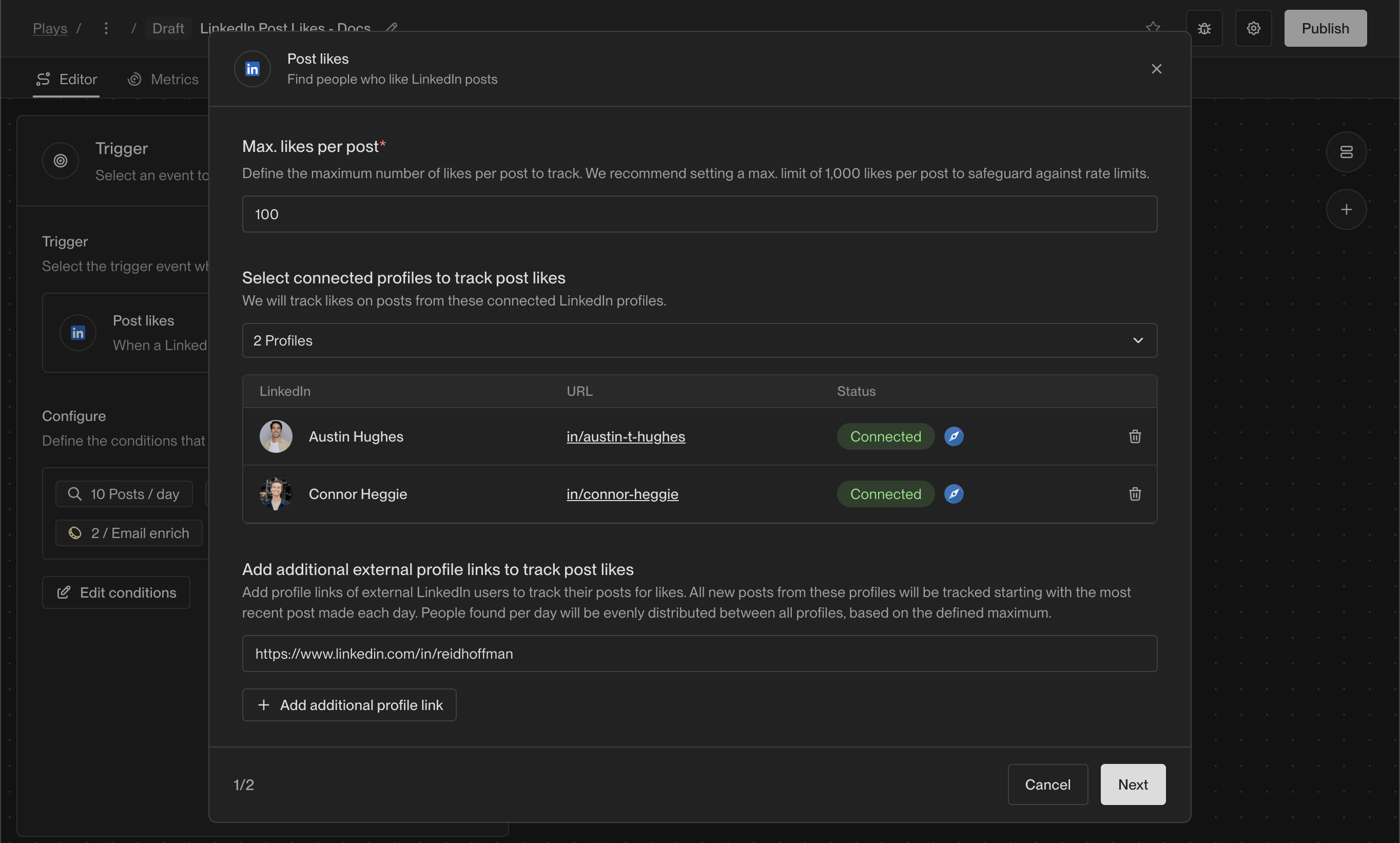 Selecting the LinkedIn Post Likes trigger