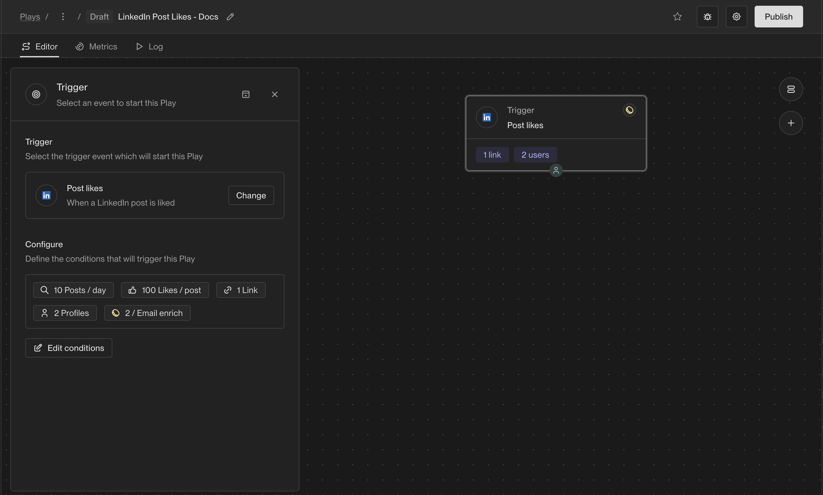 In this section, we will discuss how to build a new Play with the LinkedIn Post Likes trigger. For more detailed information on how to build a new Play, see Building a Play section of the Unify docs.